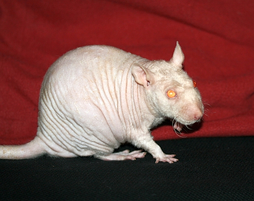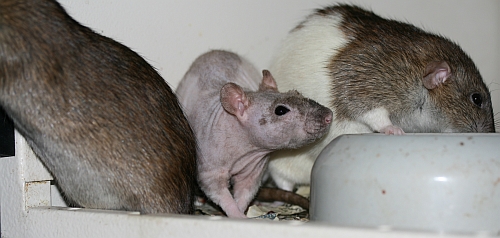 >> Rudel/Integration: Gerade für Nacktratten ist es besonders wichtig, fellige Kumpels zu haben. Bei der Integration sollte aber auch sehr vorsichtig und langsam vorgegangen werden. Das Fell dient ja auch als Schutz, der den Nackis leider fehlt. So kann eine Rattenkralle oder ein Rattenzahn schlimmere Verletzungen verursachen. |